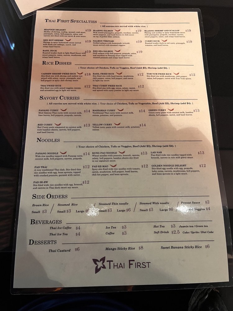 Entrées like the Chicken Panang Curry and Basil Duck are praised for their rich flavors and captivating aromas, while signature dishes, such as the popular Pad Thai, leave diners craving more. Sweeten your experience with delightful desserts, including Thai Custard and Sweet Banana Sticky Rice. With decor that sets a welcoming ambiance and friendly service, Thai First guarantees a memorable dining experience, perfect for both lunch and dinner!